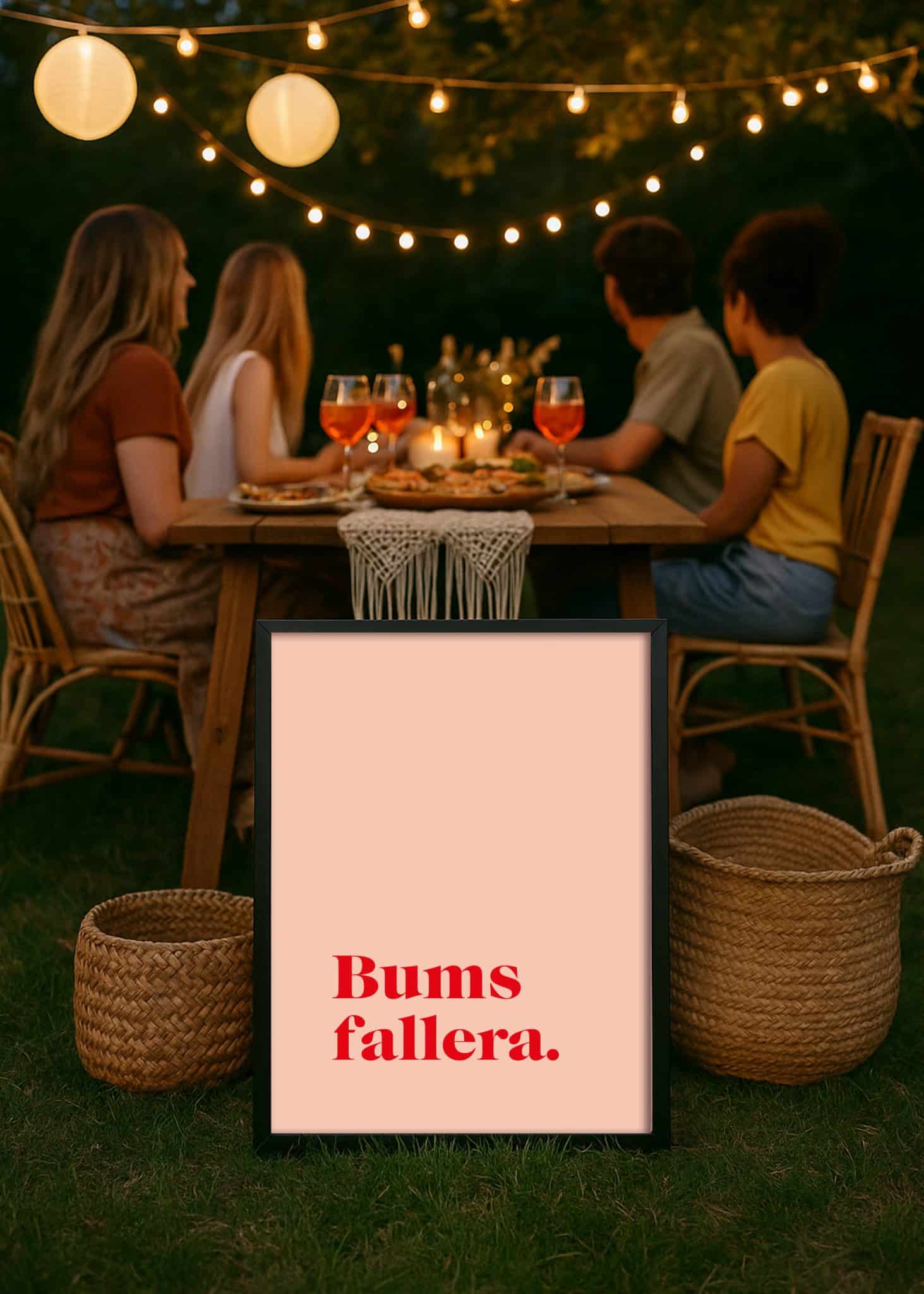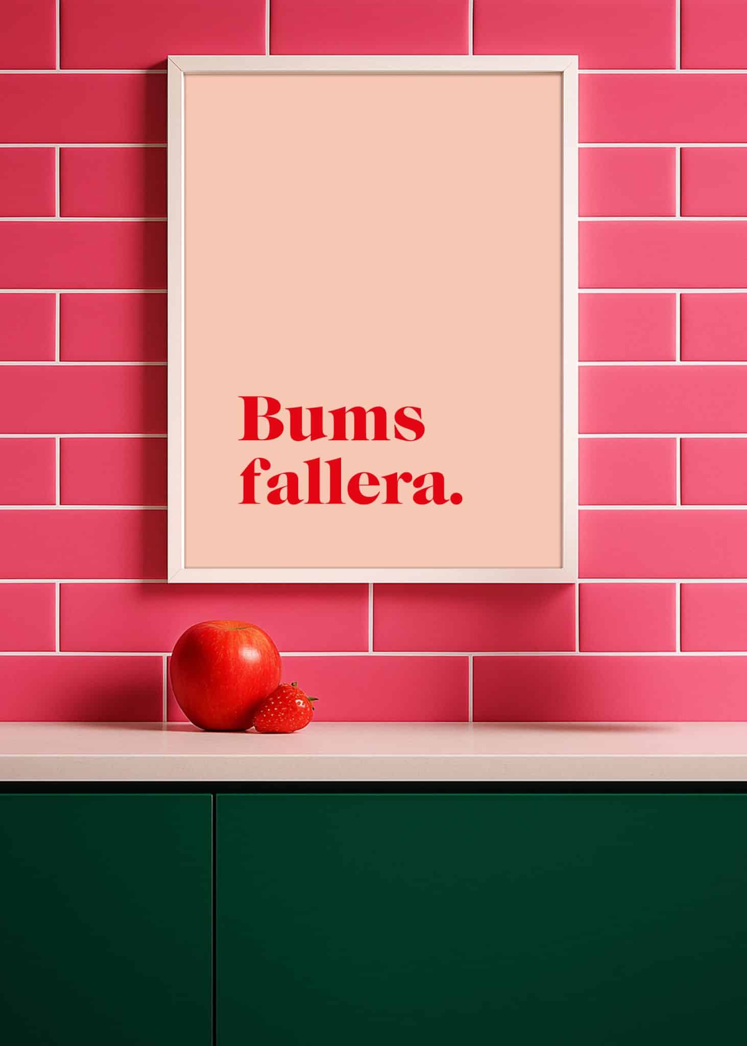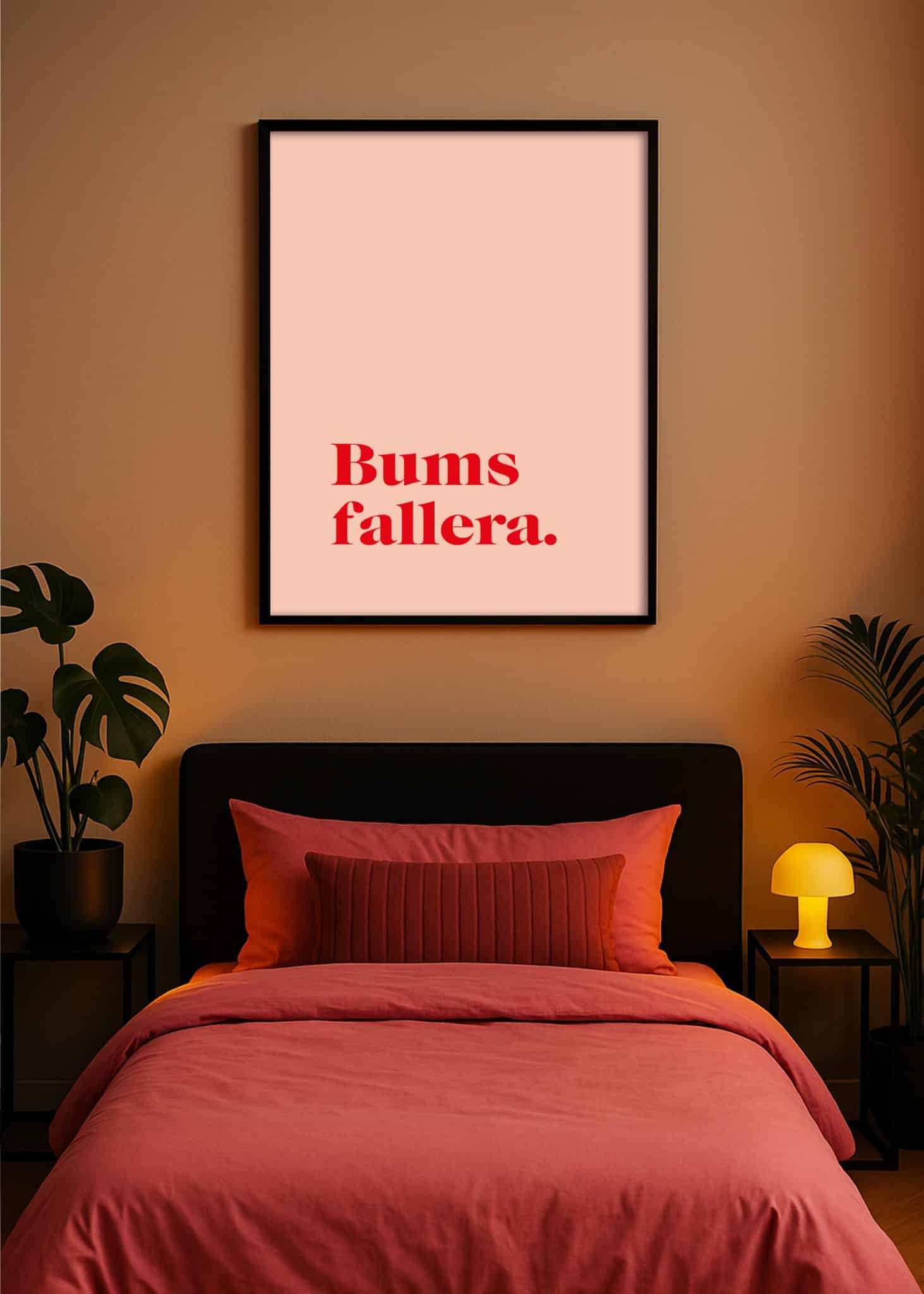 Dieses Poster ist wie ein lautes „Tschakka!“ an deiner Wand. „Bumsfallera“ sagt: Nimm’s leicht, bleib laut, tanz durchs Leben.